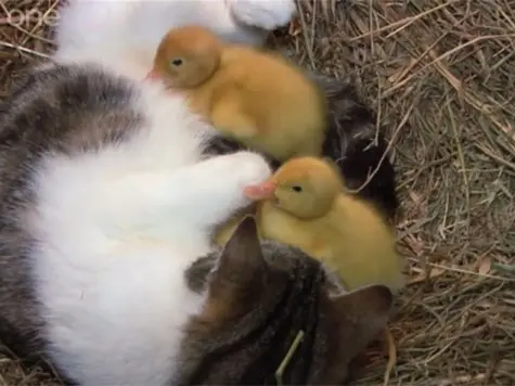 A narradora explica no vídeo que os patinhos tiveram uma tremenda ‘sorte’, já que a razão para a gata não ter atacado os patos prende-se com o facto de ela própria ter dado à luz momentos antes.
