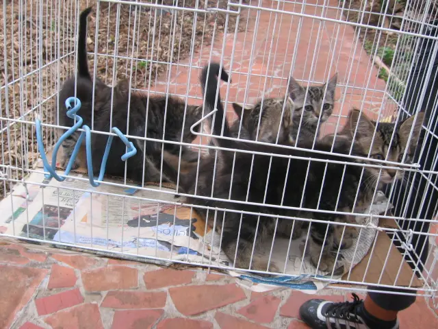 Estes gatinhos nasceram na casa de uma senhora de 86 anos, que tem problemas mentais. Os sete bebês, quatro machos e três fêmeas, estavam com rinotraqueite, já foram tratados e agora estão ótimos. Mas precisam de um lar provisório ou definitivo com urgência, pois a pessoa que os resgatou tem dez cães, e eles não convivem bem com gatos. Logo, a única opção é mantê-los enjaulados.