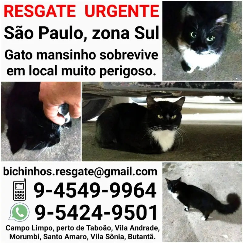 O gato fofo da imagem está em situação de abandono nas ruas do bairro Campo Limpo, zona Sul de SP. Ele é muito meigo e carinhoso. Denúncias afirmam que o local é conhecido pelo envenenamento e assassinato de gatos. Ele precisa de resgate e um abrigo seguro o quanto antes. Quem puder ajudá-lo entre em contato através do número 11 – 9-4549-9964.