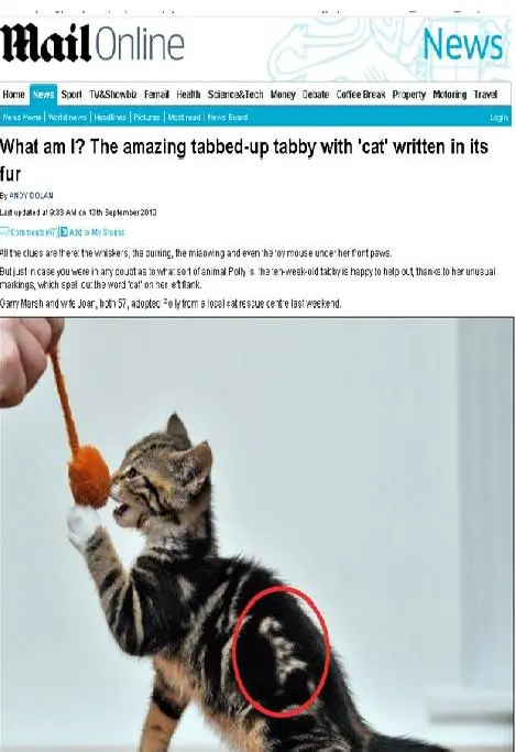 Proprietário da gatinha, o casal Gary e Joan Marsh, que mora em Newcastle-under-Lyme, no Reino Unido, disse que ficou surpreso ao encontrar a mancha curiosa em “Polly”. Segundo Gary, a “palavra” se destaca no pelo de Polly.