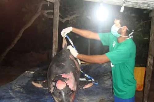 Com o apoio do Batalhão da Polícia Ambiental, a equipe do Instituto Biota realizou os primeiros levantamentos do animal no local de encalhe e depois o recolheu até a sede do Instituto, localizada em Riacho Doce, litoral norte maceioense. Segundo a análise dos biólogos, o animal se trata de um ‘Boto-Cinza’ macho, golfinho da espécie Sotália guianensis, com aproximada mente 1,75 m de comprimento.