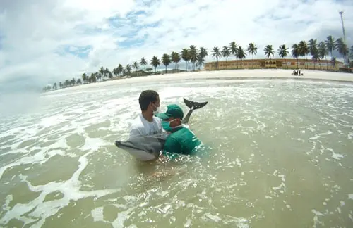 Um Golfinho Rotador macho, com 1,80 m de comprimento, encalhou vivo na tarde do domingo (11) na Praia do Pontal, em Maceió (AL).