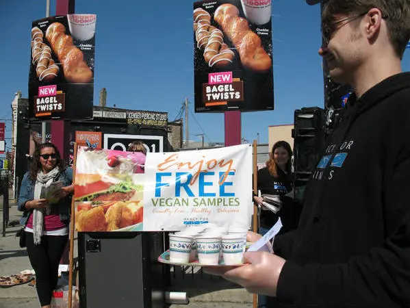 Os ativistas distribuíram donuts veganos de graça. Café com leite de soja também foi servido na manifestação.