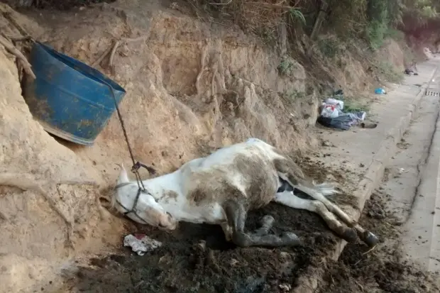 “Tem um deles que está deitado e que parece até que está doente. Outro está preso em um espaço muito pequeno e bastante machucado. Vi que tem um pouco de capim para eles em uma vasilha, mas nenhuma água. É um absurdo deixarem o animal neste estado”, reclamou Silva, que disse não ter conseguido saber de quem são os animais, porém viu carroças próximas ao local onde os cavalos estão presos.