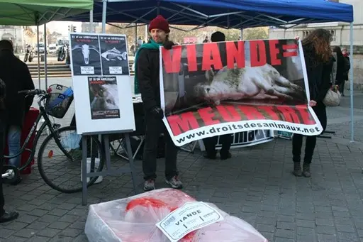 Os defensores da causa animal, pertencentes à associação “Droits des Animaux” e ao NEA (“Não à Exploração Animal”) se reuniram para evocar o “massacre cotidiano de três milhões de animais na França”. Estes militantes defendem o vegetarianismo e procuram, por meio de suas ações, conscientizar os cidadãos de Nantes, explicou Helena Besnard, presidente da associação “Droits dês animaux”.