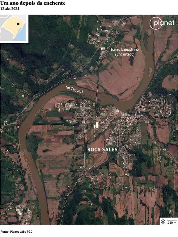 Um ano após as enchentes que atingiram o Rio Grande do Sul, milhares de hectares de áreas verdes do estado estão deterioradas. Imagens de satélite obtidas pela Folha mostram o antes e depois da devastação nos municípios de Porto Alegre, Eldorado do Sul, Lajeado e Roca Sales.