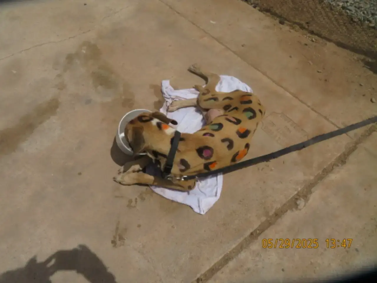 A cadela estava presa a uma cerca de arame, tentando se equilibrar em uma estreita faixa de terra para evitar o asfalto escaldante. A investigadora percebeu que ela estava amamentando e, portanto, devia haver filhotes por perto. Além disso, seu corpo estava coberto de manchas pintadas com cores vivas em estampa de oncinha.