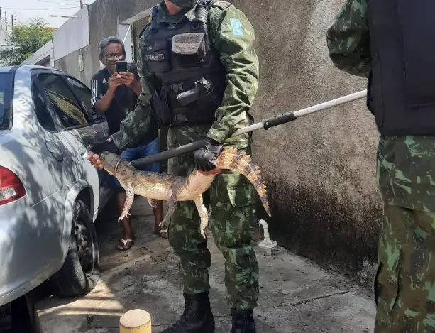 Uma jacaré foi salvo por uma equipe da Polícia Ambiental após ser arrastado pela correnteza em meio à uma enchente no bairro Mocambinho I, em Teresina (PI). O animal silvestre vivia em uma lagoa da região que teve o volume de água aumentado durante uma forte chuva nesse fim de semana.