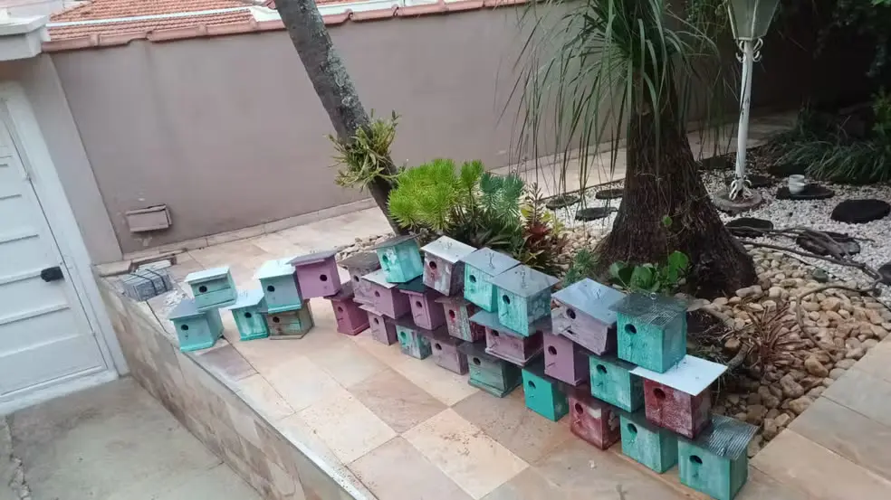 Com a ajuda da esposa, Paulo trabalha em cada detalhe: do bambu às madeiras reaproveitadas, do gancho metálico às pinturas coloridas que deixam as casinhas ainda mais bonitas. Quando encontra ninhos que já estão desgastados, reforma-os ou substitui por novos.