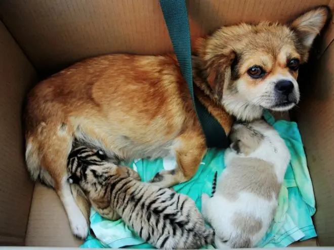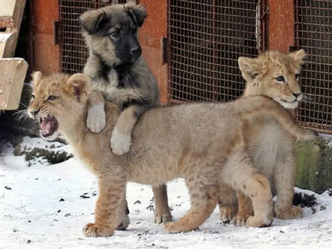 Nas fotos pode ver-se desde um cão a alimentar um tigre bebê, coelhos brincando com tigres, um macaco fazendo carinho em um cão bebê e um porco brincando com uma cabra.