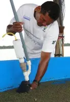 Ele conta que o diferencial da mamadeira é a haste por onde o tratador a direciona até o animal. “Com o uso da mamadeira subaquática, os animais não conseguem ver o tratador, o que favorece o comportamento arredio à presença humana, um fator bastante desejável, pois depois de soltos os animais tendem ao afastamento da civilização, dificultando a caça.”