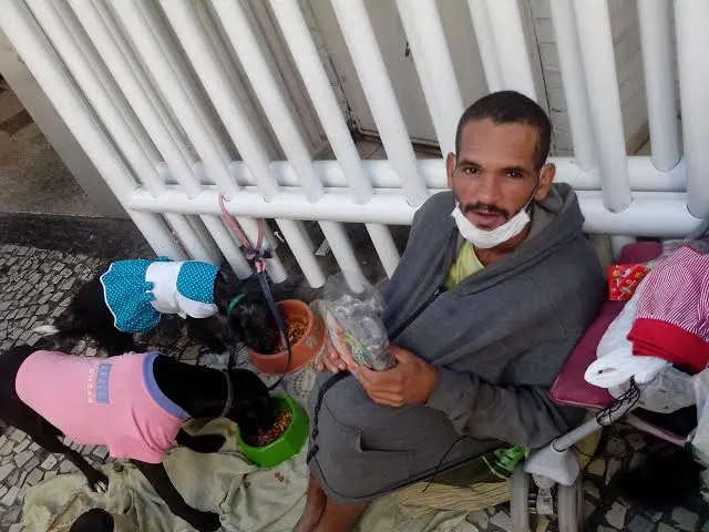 Esse homem da foto é o André, ele é um morador de rua, e ao lado dele estão suas duas cadelas. Elas são muito bem cuidadas, amadas e protegidas por ele. Como dá para ver nas fotos, até roupinhas elas usam, para se protegerem do frio. Eles estão na Tijuca, na Rua General Roca, no Rio de Janeiro e precisam de roupas para o André e ração para as cadelas. Interessados em ajudar devem entrar em contato com a Arlete através do e-mail abaixo ou ir diretamente até o local em que o André se encontra.