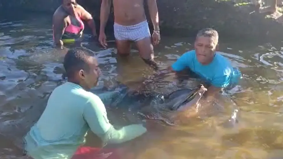 Através de imagens é possível ver que os banhistas tentaram manter o animal na água e evitar que ele encalhasse na areia da praia.