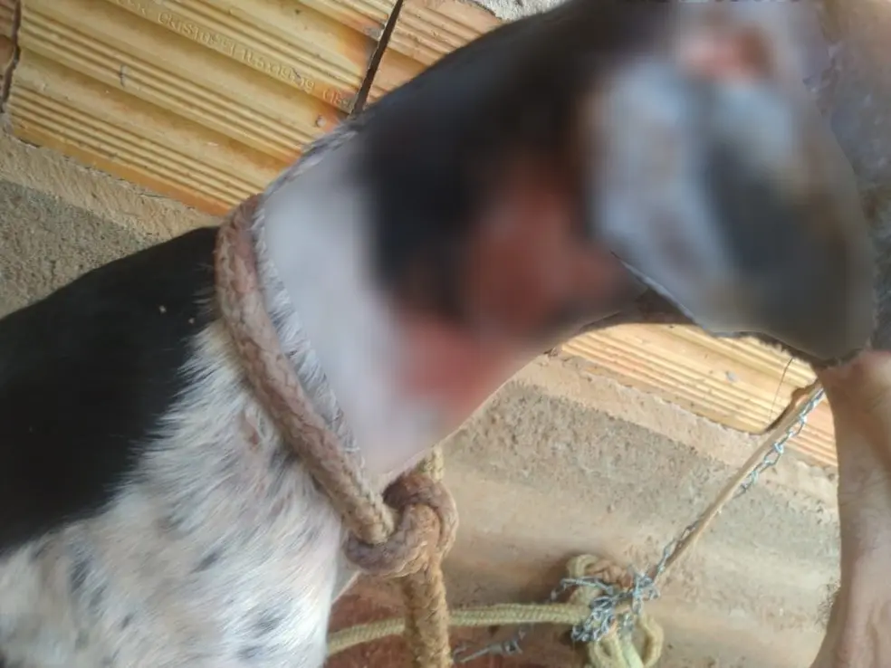 Além de estar ferido, o animal tinha como abrigo apenas algumas ripas de madeira. A responsável pelo cão estava tratando os ferimentos de forma inadequada, com um remédio específico para cavalos.