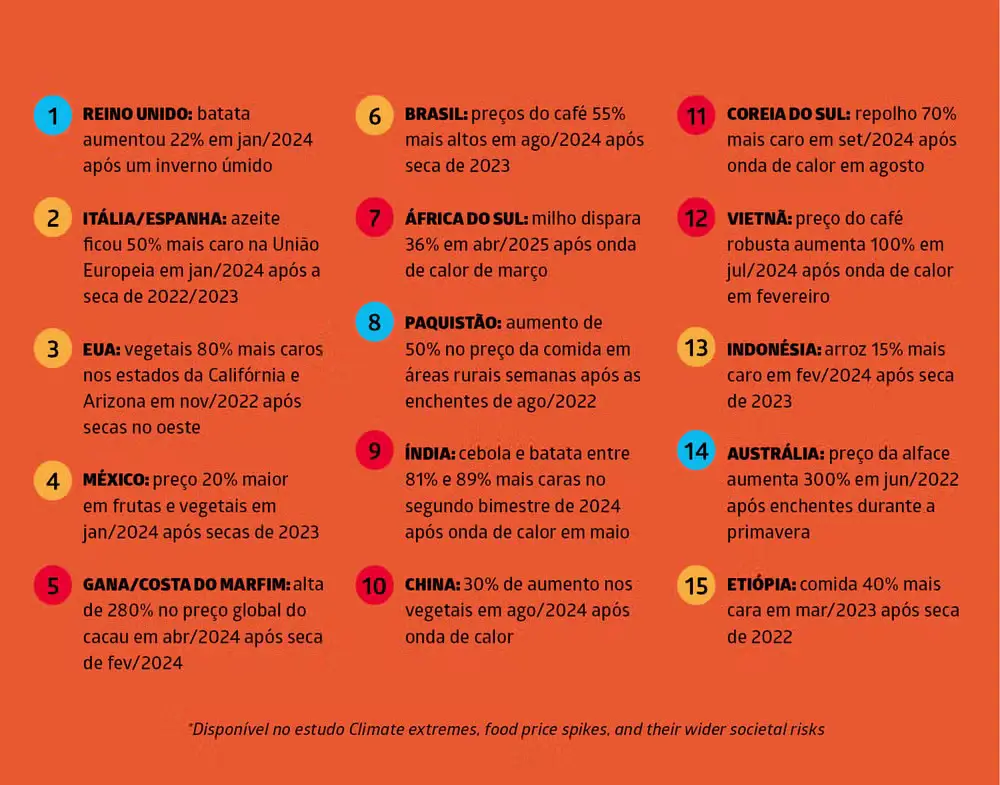 Em outro estudo, publicado em 2025 na revista Environmental Research Letters, pesquisadores europeus alertam que os extremos climáticos estão impulsionando crises sociais por meio do sistema alimentar. O grupo destaca que 2024 foi o ano mais quente já registrado – o primeiro em que as temperaturas globais ultrapassaram 1,5°C acima dos níveis pré-industriais, com 1,6ºC de alta. E que os picos nos preços dos alimentos se tornaram o segundo impacto climático mais citado no mundo, atrás apenas do calor extremo.