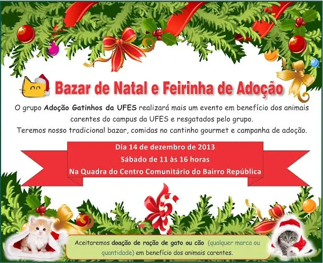 O grupo Adoção Gatinhos da Ufes realizará um Bazar de Natal e Feira de Adoção com toda a renda arrecadada revertida em benefício dos animais carentes que vivem no campus da Ufes e resgatados pelas voluntárias. Haverá bazar, lojinha e cantinho gourmet. Muitos animais estarão lá a espera de uma família.