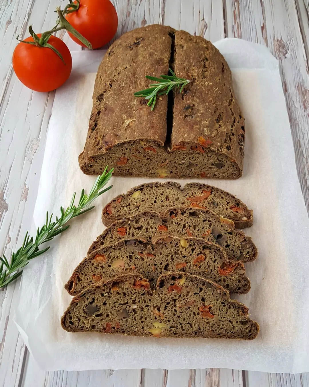 Em seguida, sove a massa novamente por alguns instantes. Misture os tomates secos, as azeitonas.