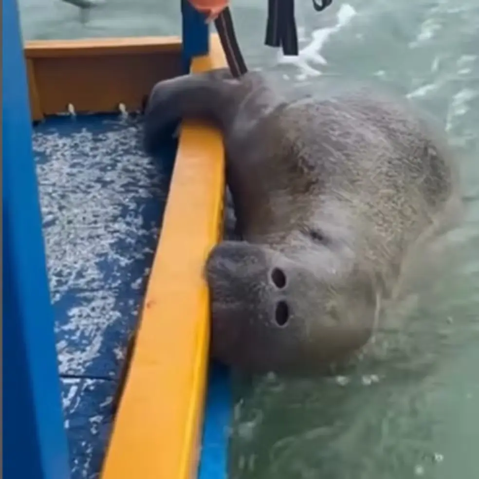 No vídeo, o animal chegou a encostar as nadadeiras no barco, como se buscasse carinho, antes de se afastar.
