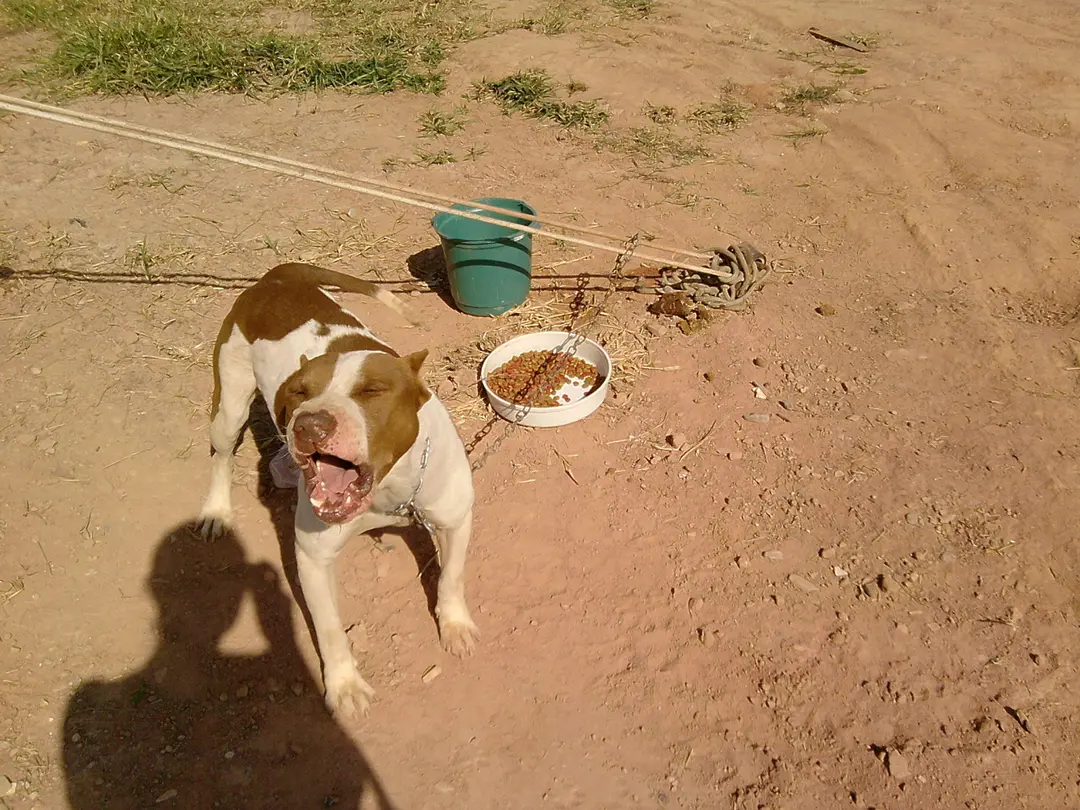 Fiquei sabendo que às vezes fica sem comer e sem água. O caseiro o alimenta somente por temer que um cachorro desta raça fique faminto e queira atacar.