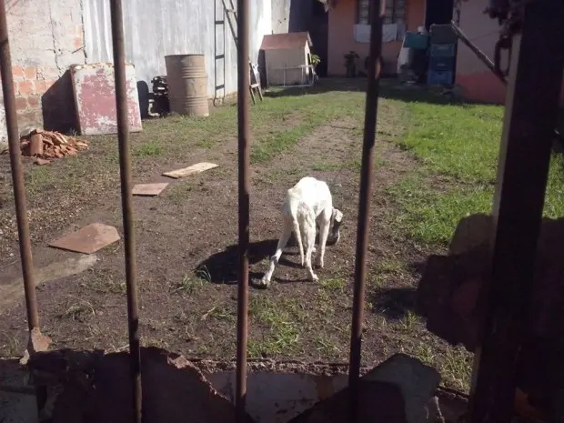 O cão estava extremamente magro com lesões no corpo. A responsável se negou a atender a equipe da DPMA e agrediu verbalmente, jogava água pelo portão e já havia jogado pedras nos policiais anteriormente. Segurava o cão com violência, sendo que o animal demonstrava medo quando ela se aproximava. Afirmou que o cão estava bem e tinha atendimento veterinário. Não havia possibilidade de orientação a esta pessoa e procedemos com o resgate do animal pela Sociedade Protetora dos Animais de Curitiba(SPAC) com o apoio da DPMA.