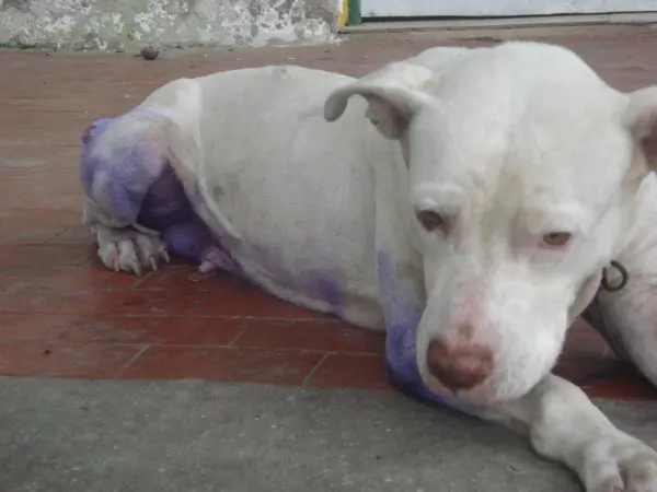O local é próximo à Padaria Glamour, ao lado de uma creche. Ela está com fome, sem água, com câncer e cheia de berne.