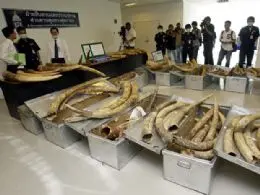 Autoridades ambientais do governo da Tailândia exibiram nesta sexta-feira (25) uma tonelada de presas de marfim de elefantes e chifres de rinocerontes contrabandeados ilegalmente e apreendidos no aeroporto de Suvarnabhumi, em Bangcoc, capital do país.