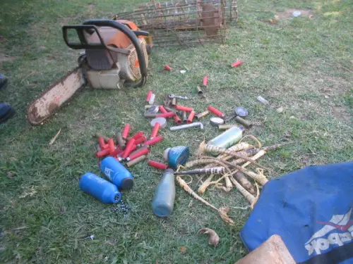 Foram apreendidos: um revólver calibre 38, uma espingarda calibre 28, dois covos de arame, uma motosserra, um alçapão, 16 cartuchos de metal calibre 28 vazios, 41 cartuchos de plástico calibre 32 vazios, 11 cartuchos de plástico calibre 32 carregados, 16 rabos de tatu e 9 patas de tatu.