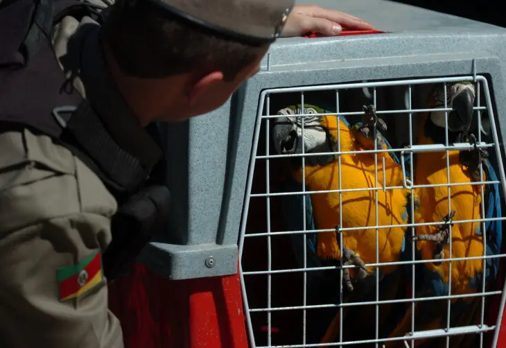 A Patrulha Ambiental da Brigada Militar resgatou na manhã desta terça-feira duas araras em um cativeiro no interior de Pelotas, no sul do RS. Os animais da espécie canindé (Ara ararauna) eram mantidos sem autorização do Ibama no lugar há dois anos.