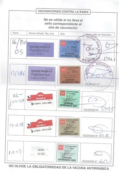 Junto com o poodle muito velhinho e doente, tinha uma carteirinha de vacinação toda escrita em espanhol, de Madri, assim como as duas plaquinhas, uma amarela e outra vermelha no qual estava escrito os seguinte: COLÉGIO VETERINÁRIOS COMUNIDAD DE MADRID/ ESTOY IDENTIFICADO TELEFONO 91 5645459 (amarela) e LUCHA ANTIRRABICA COMUNIDAD DE MADRID 2010 M.