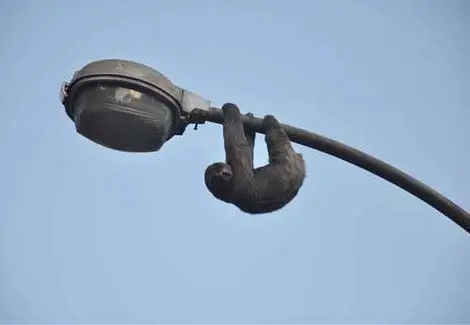 Por exemplo, outro dia resolvi dar um rolê. Cansei do parque. Coisa mais chata ficar por ali o tempo todo, vendo as mesmas árvores, o mesmo lago. Deu tédio. Naquele dia precisava de um pouco de agito, entende? E, como sei que aqui a “barra é mansa”, senti segurança para deixar o parque e fui, pasmem com o trocadinho, para o “Jardim da Preguiça”. Achei engraçado e pensei: Bom, o jardim é meu mesmo, né? Mas, como não sou tatu, e sim preguiça, não fiquei pelas calçadas, não. Fui logo para o alto. Brinquei com a fiação elétrica, me equilibrei, dei cambalhotas. Eu sei, eu sei… é perigoso. Foi mal, não vou repetir. E quando já estava bem agitada, com o coração a mil, achei que era hora de me acalmar. Fiz umas posições de ioga, começando pelo cachorro, o gato, a criança e descansei na minha posição preferida: preguiça balança o corpinho lindo em poste de luz. Fiquei ali, num balancinho bom, sentindo o vento nos meus pelos, segurando, segurando, e pensando em nomes de posturas. Quando faço tai chi, bem cedinho no parque, com um grupo de terceira idade que vai saudar o nascer do sol, há posturas como: abraçar a árvore, macaco branco oferece o pêssego, espetando agulhas no fundo do mar e por aí vai…