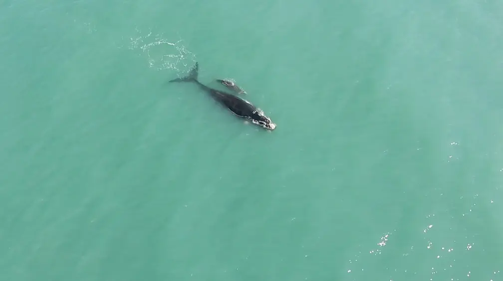 Pesquisadores avistaram o primeiro filhote de baleia-franca da temporada de baleias em Santa Catarina. O animal foi visto na última terça-feira (29) em uma praia de Imbituba e estava acompanhado de sua mãe.