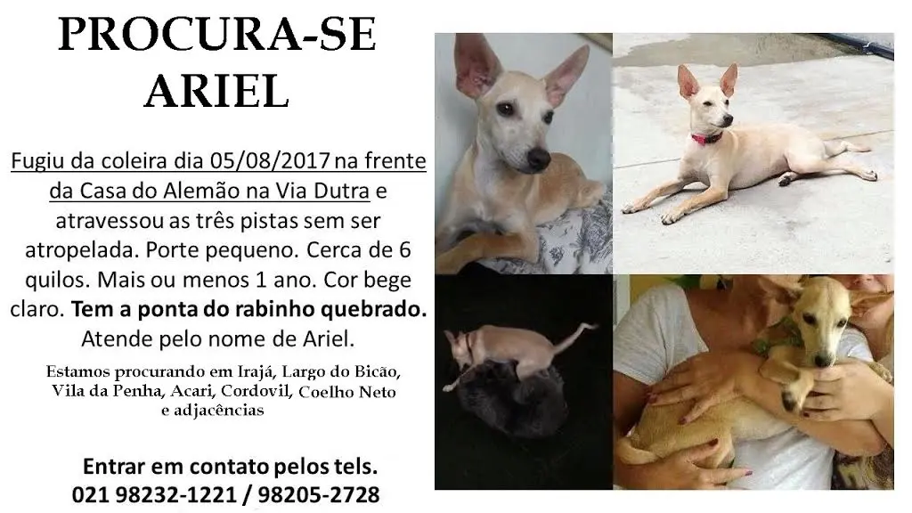 A cadelinha do cartaz se chama Ariel. Ela fugiu pela Via Dutra, próxima à Casa do Alemão, Casa do Alemão, altura de São João de Meriti (RJ). Testemunhas afirmam que a cadelinha foi avistada a 12km do local, na Av. Brás de Pina. A tutora de Ariel está realizando uma verdadeira peregrinação em todos os bairros do entorno. Quem tiver informações sobre a cadelinha entre em contato com a Miriam através do telefone: 21 – 98232 1221.