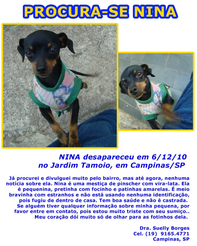 Estou tão triste, pois, minha cachorrinha, a Nina, uma mestiça de pinscher com viralata, sumiu no dia 6/12/2010, de madrugada, e, desde então estou a procurando. Já colocamos cartazes com a foto dela, andei pelo bairro todo, chamei por ela onde andava e envie um e-mail também para o e-mail [email protected], e, eles publicaram, mas até agora, nada.
