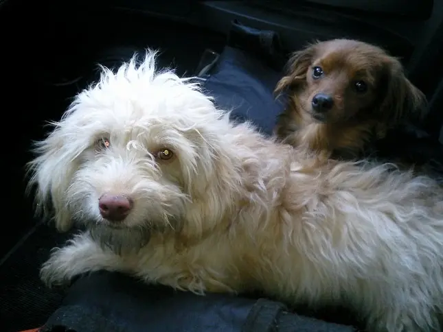 Uma é poodle com pelo liso, sem rabo e novinha, deve ter uns 07 meses. A outra parece uma yorkshire ou uma teckel de pelo comprido e é muito pequena, deve pesar uns 2 kg.