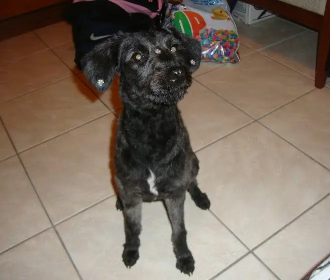 Parece ser uma mestiça de poodle, ainda filhota, deve ter por volta de uns 8 meses e não deve crescer mais. Ainda não está castrada, mas já estamos providenciando a sua castração e vermifugação.