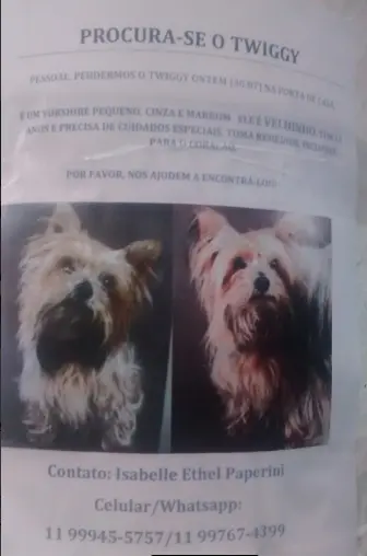 O yorkshire da imagem se chama Twiggy. Ele desapareceu no dia 30 de julho na região de Santo Amaro, na zona Sul de SP. Ele é idoso e precisa de cuidados especiais e remédios controlados diários. Quem tiver informações sobre o paradeiro dele entre em contato através dos telefones disponibilizados no cartaz abaixo.