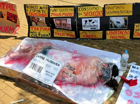 Para chamar a atenção dos frequentadores, os ativistas montaram uma bandeja de carne humana gigante personificada pelo estudante de biologia e vegano Jeff Davis — que ficou deitado numa espécie de isopor com tinta vermelha por todo o corpo e um plástico por cima. “Parece mesmo uma bandeja de carne, só que humana”, comentou Aline Gomes da Silva, que passava pela praça.