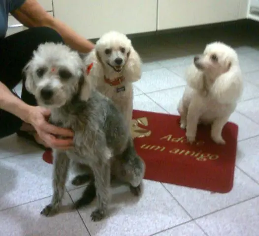 Eles também têm um macho, um poodle branco cego de um olho, furado pelo gato. Com ele, elas ficaram. As cachorras estavam infestadas de pulgas, não era necessário procurar entre os pelos, pois podia-se ver as pulguinhas andando ao redor dos olhos. Comiam uma ração horrível e passavam o dia sozinhas, confinadas na laje, enquanto o poodle macho passeia feliz pela casa.