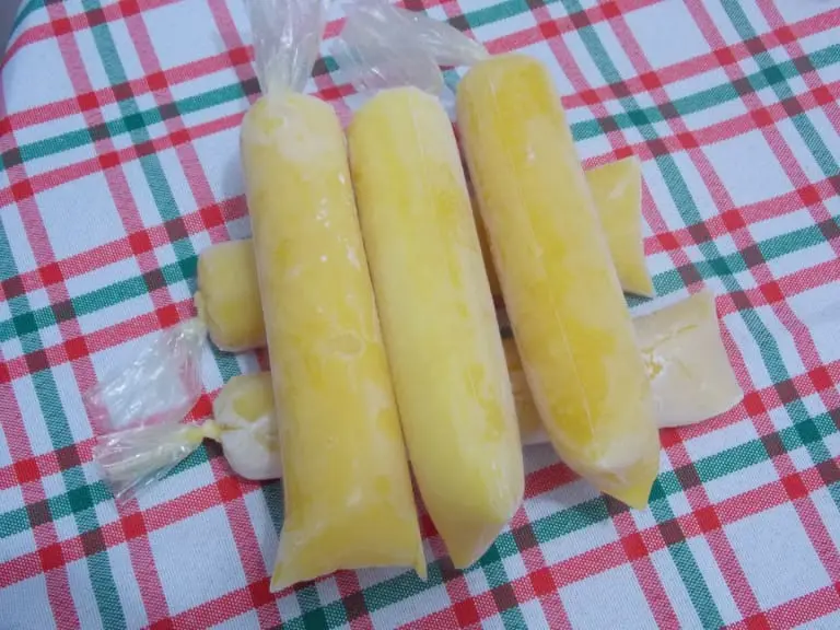 - Depois de encher e amarrar a extremidade de cada saquinho coloque-os em uma tabuleiro e leve-os para o congelador, em média depois de duas horas eles já estão congelados e ótimos para serem consumidos.