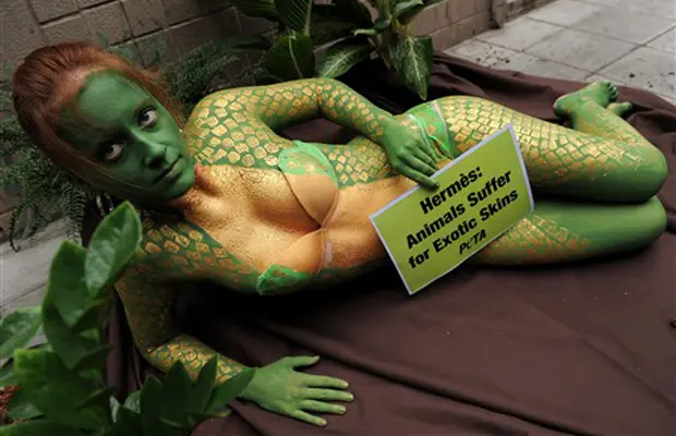 Modelo pintada de cobra protesta contra o uso de pele, na Tailândia