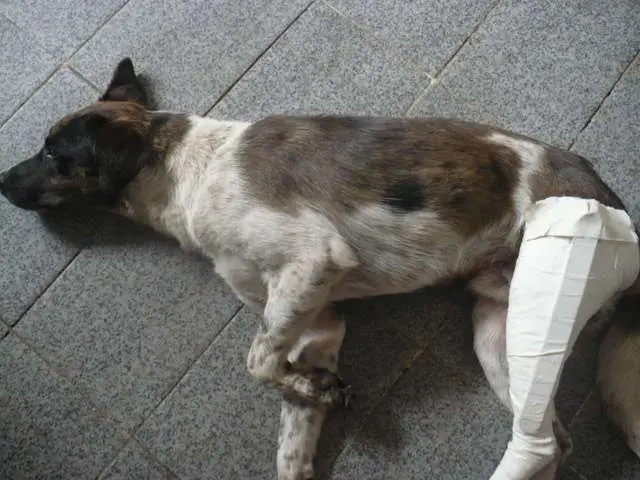 Cão é encontrado muito ferido com uma tala na pata abandonado na rua, em São Miguel (SP)