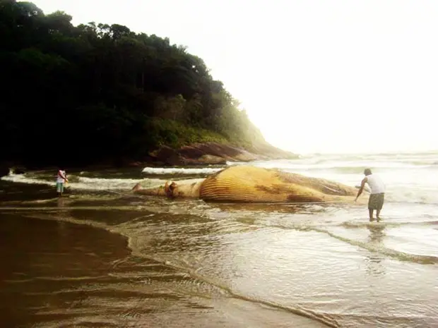 Corpo de baleia de 14 metros é achada em praia deserta de Peruíbe (SP)