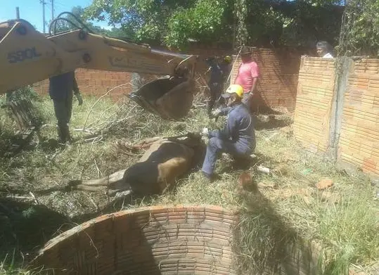 Bombeiros levam 4 horas para salvar boi que caiu em poço de 5 metros