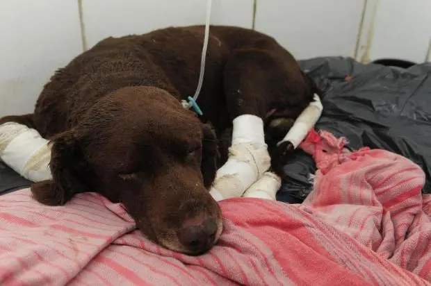 Cão queimado vivo piora após descoberta de novos ferimentos