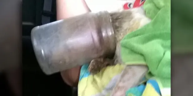 Cachorra é abandonada com um pote de plástico preso na cabeça na beira de uma rodovia