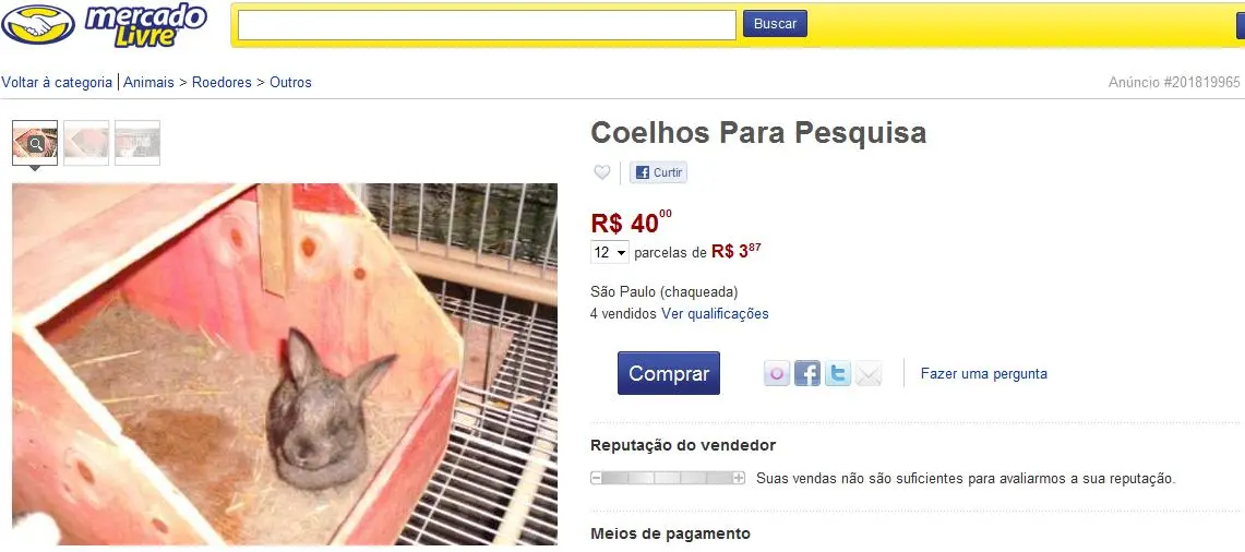 Usuário anuncia venda de animais para experimentação no site do Mercado Livre
