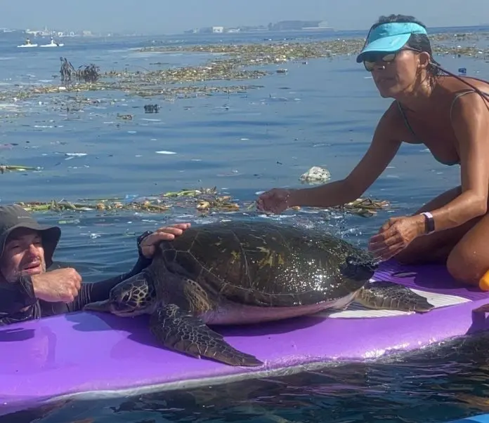 Uma tartaruga-marinha foi salva por dois praticantes de stand up paddle na Baía de Guanabara, na região da Zona Sul do Rio. O animal estava enroscado em sacolas plásticas. Eles afirmam que a tartaruguinha estava ofegante e tentava se libertar dos resíduos plásticos.