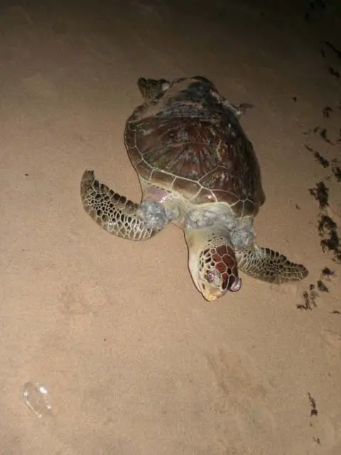 Uma tartaruga da espécie Chelonia mydas, mais conhecida como “tartaruga verde”, de 92 centímetros, foi encontrada morta na noite desta terça-feira (21) na praia de Jatiúca. A tartaruga estava boiando nas águas e foi levada pelas ondas para a beira do mar. Dois homens que passavam no momento ajudaram a desemborcar o animal, que pesa, em média, 30 quilos. Na semana passada, outra tartaruga foi encontrada morta neste mesmo trecho de praia.