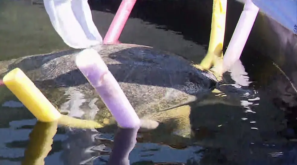 Parte do tratamento envolve deixar o animal boiar em “macarrões”, tipo de flutuador também usado por humanos e que facilita a tartaruga a expelir o lixo ingerido no mar.