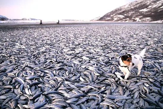 Uma fotografia divulgada nesta segunda-feira (2) mostra as toneladas de arenques mortos que apareceram em uma praia ao norte da Noruega no dia 31 de dezembro de 2011.